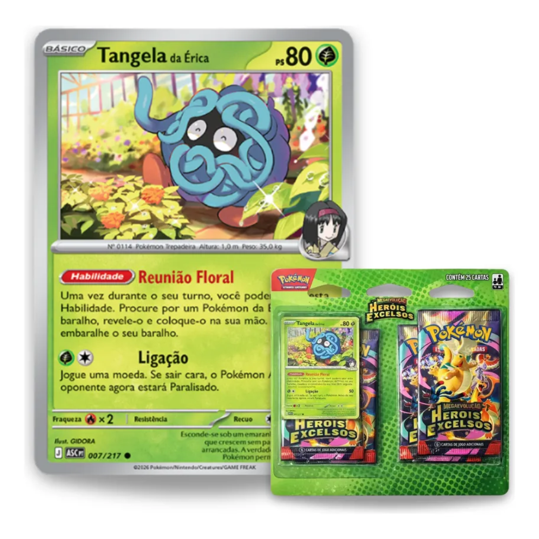 Descubra o Blister Triplo Pokémon Heróis Excelsos Tangela da Erika ME2, uma adição imperdível para qualquer colecionador e entusiasta do Pokémon Trading Card Game.
